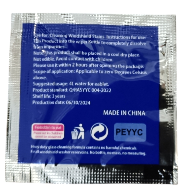 - Sekoita tabletti litraan vettä, kaada seos lasinpesunestesäiliöön, tämän jälkeen lisää vettä vielä 3 litraa lasinpesunestesäiliöön